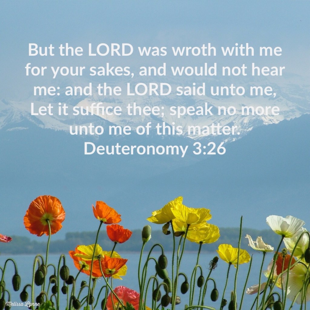 And I besought the LORD at that time, saying, O Lord GOD, thou hast begun to shew thy servant thy greatness, and thy mighty hand: for what God is there in heaven or in earth, that can do according to thy works, and according to thy might? I pray thee, let me go over, and see the good land that is beyond Jordan, that goodly mountain, and Lebanon. But the LORD was wroth with me for your sakes, and would not hear me: and the LORD said unto me, Let it suffice thee; speak no more unto me of this matter. Get thee up into the top of Pisgah, and lift up thine eyes westward, and northward, and southward, and eastward, and behold it with thine eyes: for thou shalt not go over this Jordan. But charge Joshua, and encourage him, and strengthen him: for he shall go over before this people, and he shall cause them to inherit the land which thou shalt see. – Deuteronomy 3:23-28