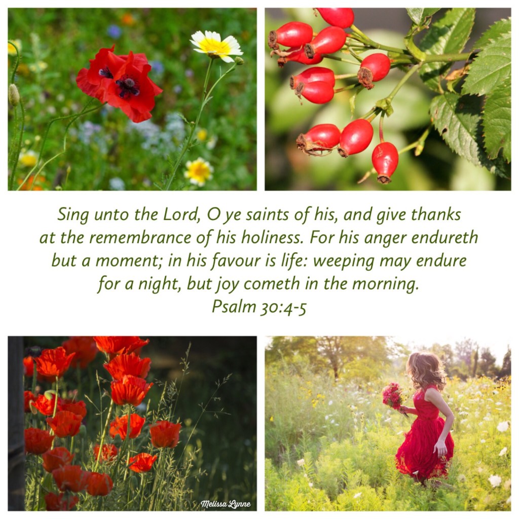 Sing unto the Lord, O ye saints of his, and give thanks at the remembrance of his holiness. For his anger endureth but a moment; in his favour is life: weeping may endure for a night, but joy cometh in the morning. – Psalm 30:4-5