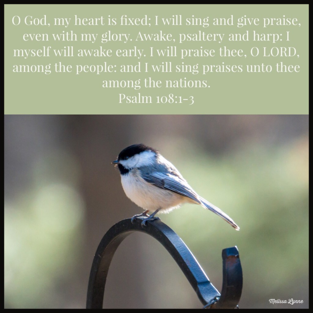 O God, my heart is fixed; I will sing and give praise, even with my glory. Awake, psaltery and harp: I myself will awake early. I will praise thee, O LORD, among the people: and I will sing praises unto thee among the nations. – Psalm 108:1-3