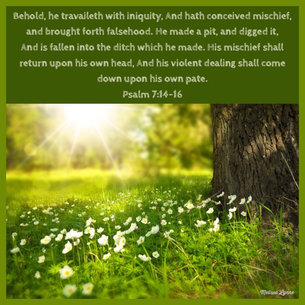 If he turn not, he will whet his sword; he hath bent his bow, and made it ready. He hath also prepared for him the instruments of death; he ordaineth his arrows against the persecutors. Behold, he travaileth with iniquity, and hath conceived mischief, and brought forth falsehood. He made a pit, and digged it, and is fallen into the ditch which he made. His mischief shall return upon his own head, and his violent dealing shall come down upon his own pate. – Psalm 7:12-16