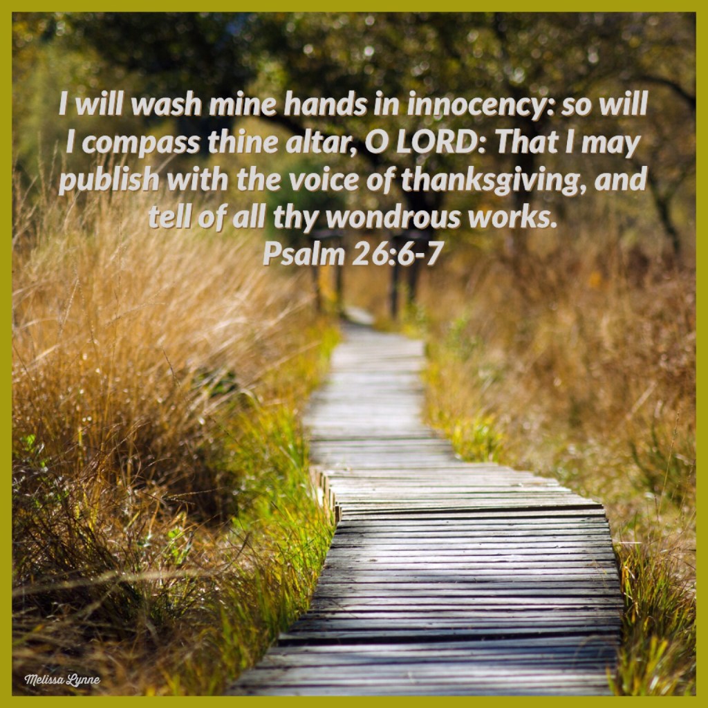 I will wash mine hands in innocency: so will I compass thine altar, O LORD: That I may publish with the voice of thanksgiving, and tell of all thy wondrous works. – Psalm 26:6-7