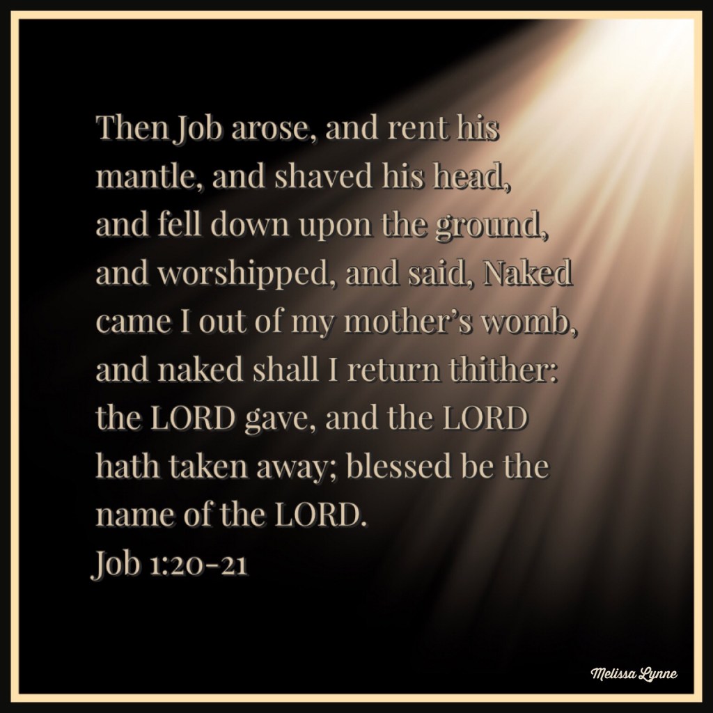 Then Job arose, and rent his mantle, and shaved his head, and fell down upon the ground, and worshipped, and said, Naked came I out of my mother’s womb, and naked shall I return thither: the LORD gave, and the LORD hath taken away; blessed be the name of the LORD. In all this Job sinned not, nor charged God foolishly. – Job 1:20-22