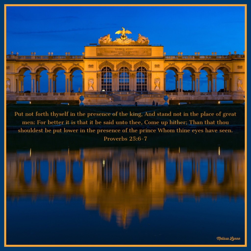 Put not forth thyself in the presence of the king, And stand not in the place of great men: For better it is that it be said unto thee, Come up hither; Than that thou shouldest be put lower in the presence of the prince Whom thine eyes have seen. – Proverbs 25:6-7