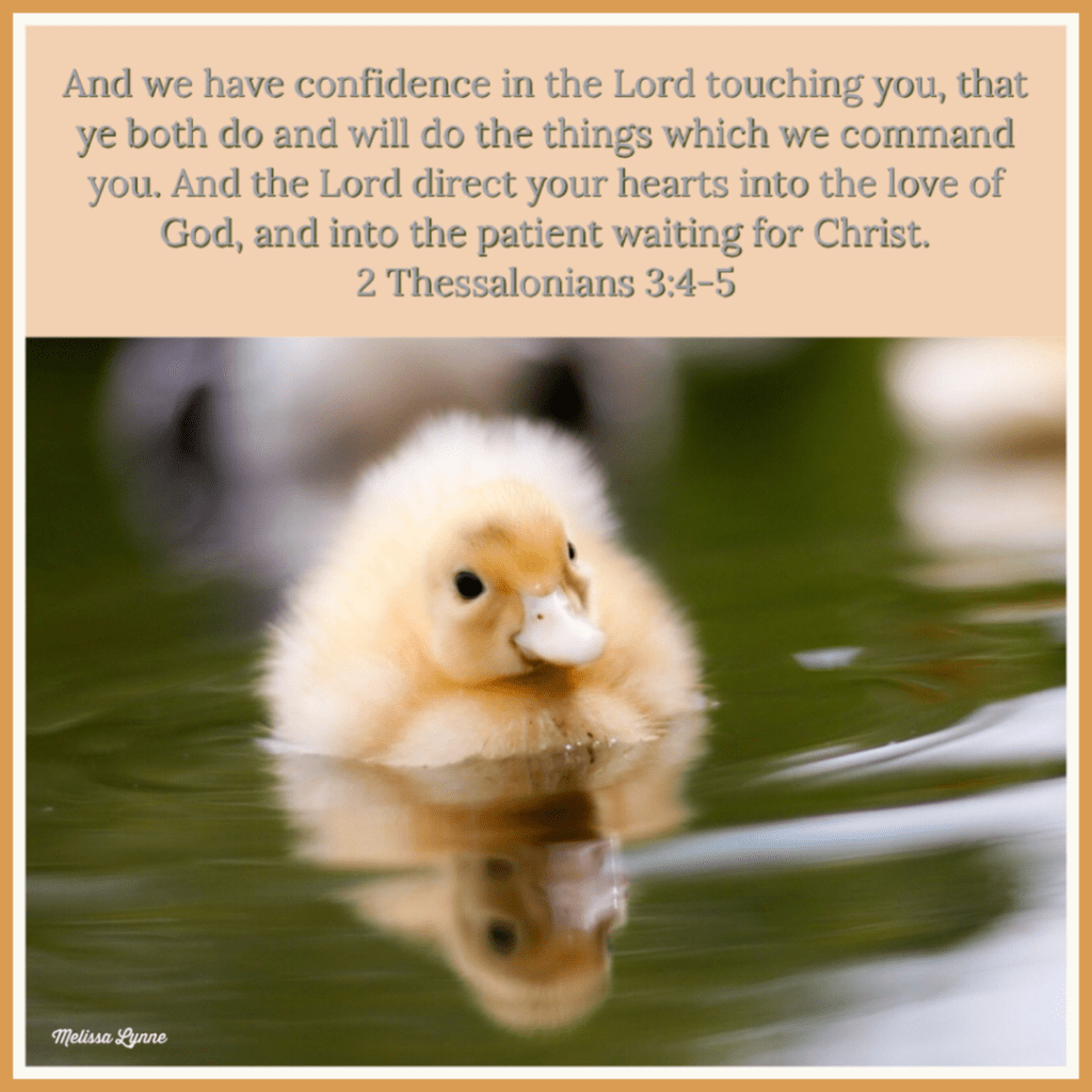 But the Lord is faithful, who shall stablish you, and keep you from evil. And we have confidence in the Lord touching you, that ye both do and will do the things which we command you. And the Lord direct your hearts into the love of God, and into the patient waiting for Christ. – 2 Thessalonians 3:3-5