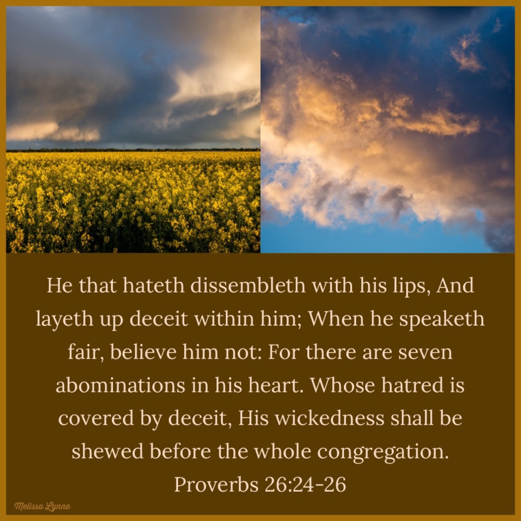 He that hateth dissembleth with his lips, And layeth up deceit within him; When he speaketh fair, believe him not: For there are seven abominations in his heart. Whose hatred is covered by deceit, His wickedness shall be shewed before the whole congregation. – Proverbs 26:24-26