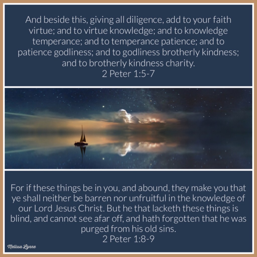 And beside this, giving all diligence, add to your faith virtue; and to virtue knowledge; and to knowledge temperance; and to temperance patience; and to patience godliness; and to godliness brotherly kindness; and to brotherly kindness charity. For if these things be in you, and abound, they make you that ye shall neither be barren nor unfruitful in the knowledge of our Lord Jesus Christ. But he that lacketh these things is blind, and cannot see afar off, and hath forgotten that he was purged from his old sins. – 2 Peter 1:5-9