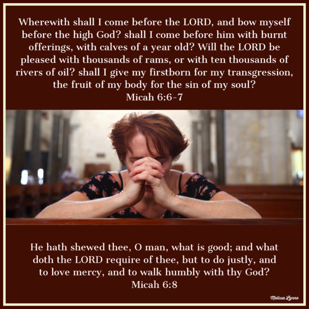 Wherewith shall I come before the LORD, and bow myself before the high God? shall I come before him with burnt offerings, with calves of a year old? Will the LORD be pleased with thousands of rams, or with ten thousands of rivers of oil? shall I give my firstborn for my transgression, the fruit of my body for the sin of my soul? – Micah 6:6-7