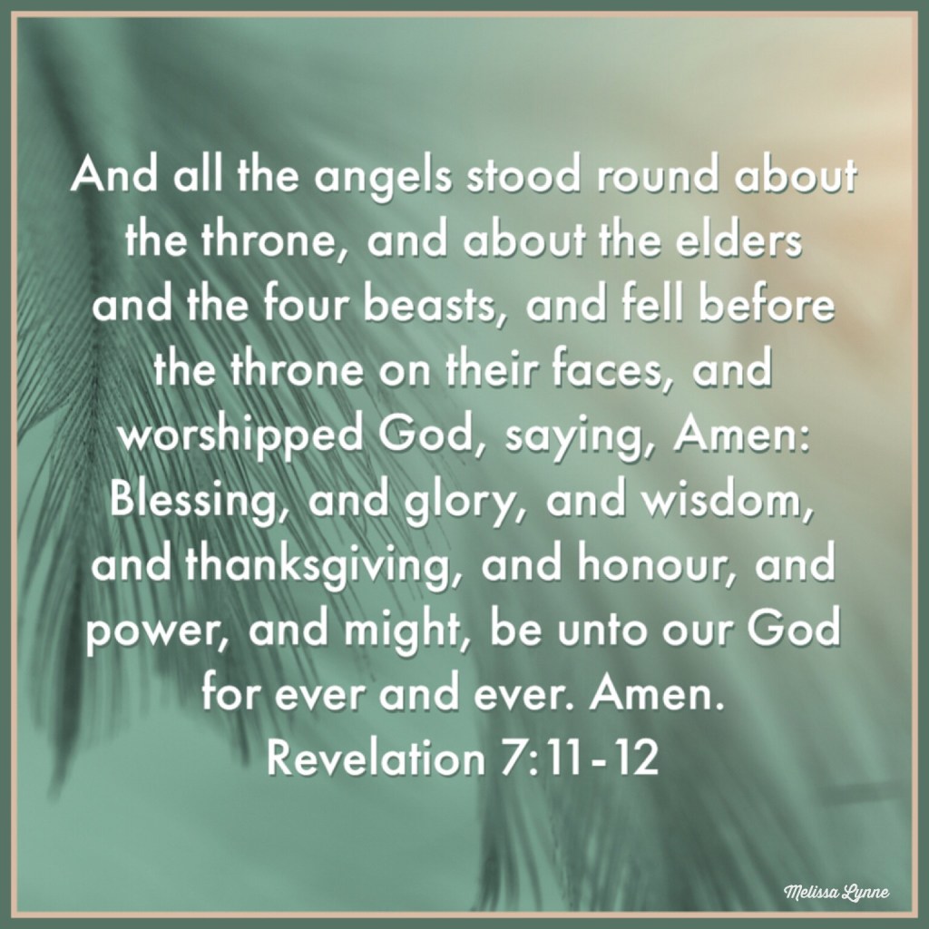 And all the angels stood round about the throne, and about the elders and the four beasts, and fell before the throne on their faces, and worshipped God, saying, Amen: Blessing, and glory, and wisdom, and thanksgiving, and honour, and power, and might, be unto our God for ever and ever. Amen. – Revelation 7:11-12