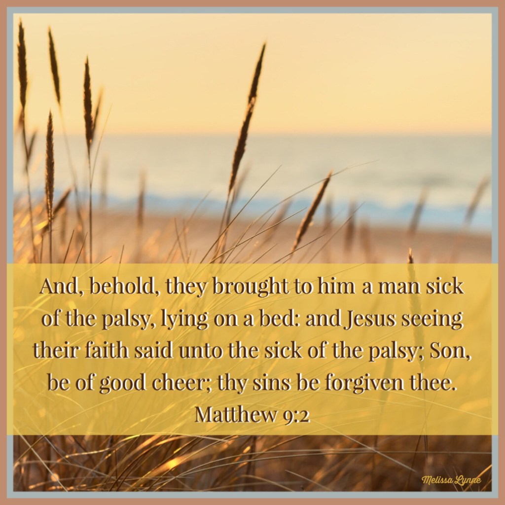 And he entered into a ship, and passed over, and came into his own city. And, behold, they brought to him a man sick of the palsy, lying on a bed: and Jesus seeing their faith said unto the sick of the palsy; Son, be of good cheer; thy sins be forgiven thee. – Matthew 9:1-2