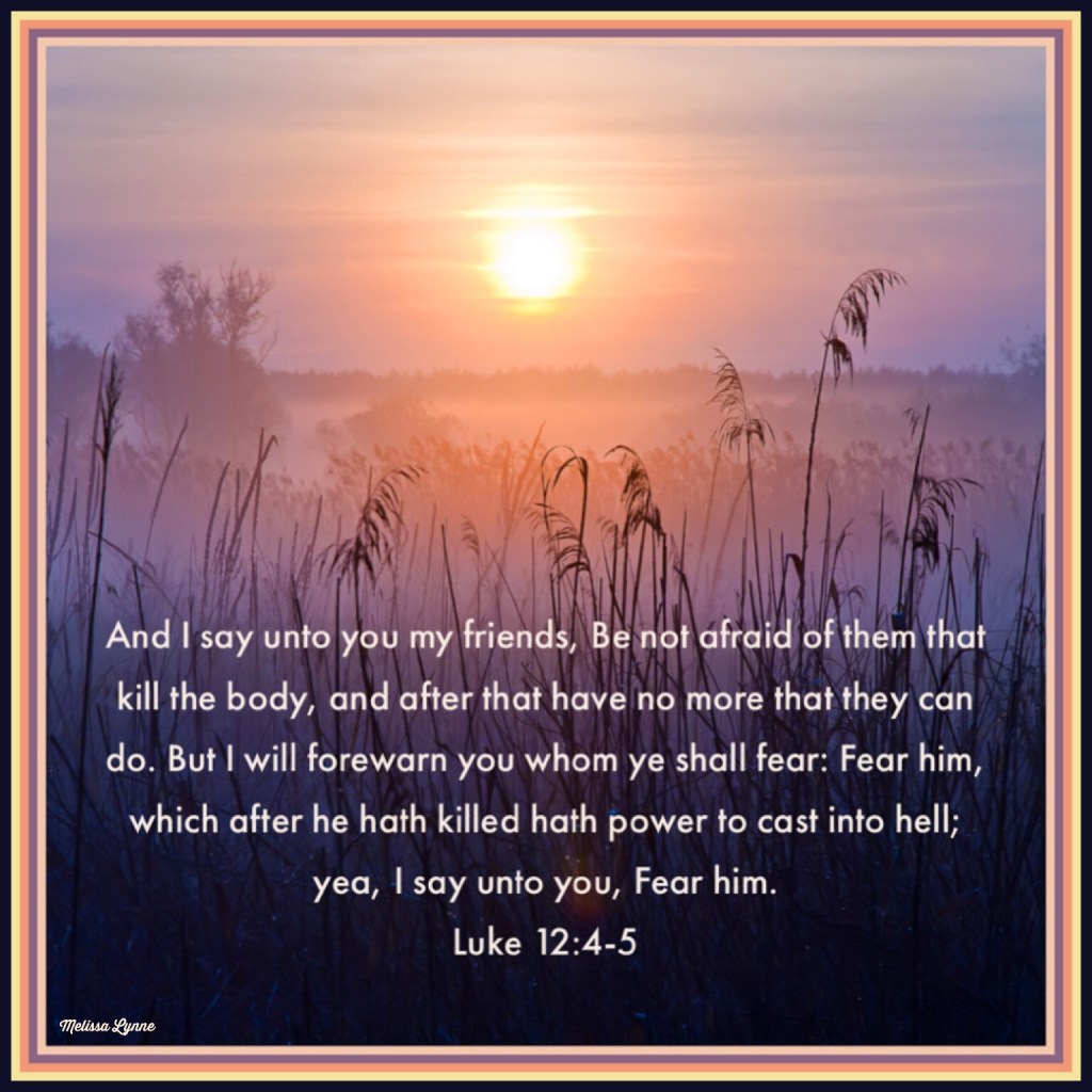And I say unto you my friends, Be not afraid of them that kill the body, and after that have no more that they can do. But I will forewarn you whom ye shall fear: Fear him, which after he hath killed hath power to cast into hell; yea, I say unto you, Fear him. Are not five sparrows sold for two farthings, and not one of them is forgotten before God? But even the very hairs of your head are all numbered. Fear not therefore: ye are of more value than many sparrows. – Luke 12:4-7