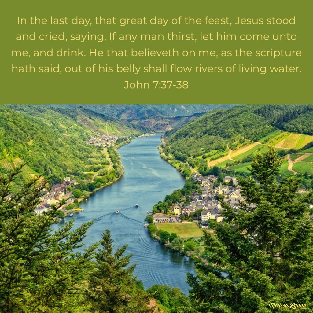 In the last day, that great day of the feast, Jesus stood and cried, saying, If any man thirst, let him come unto me, and drink. He that believeth on me, as the scripture hath said, out of his belly shall flow rivers of living water. (But this spake he of the Spirit, which they that believe on him should receive: for the Holy Ghost was not yet given; because that Jesus was not yet glorified.) – John 7:37-39