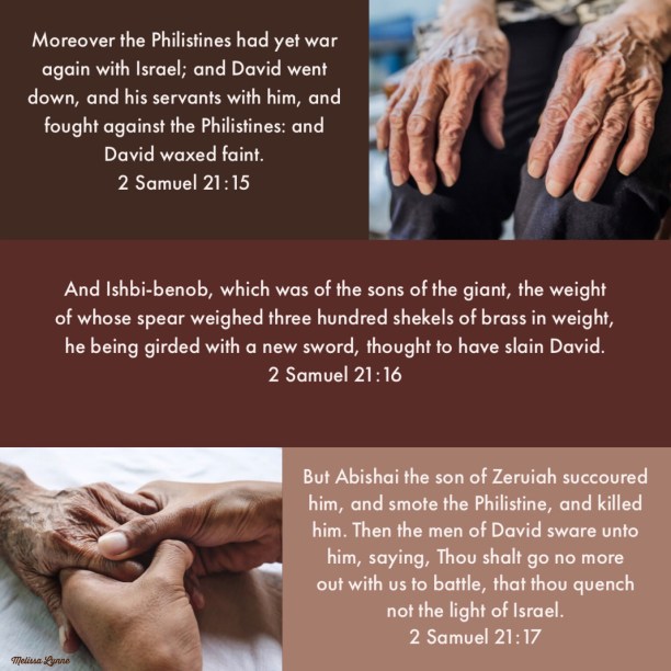 Moreover the Philistines had yet war again with Israel; and David went down, and his servants with him, and fought against the Philistines: and David waxed faint. And Ishbi-benob, which was of the sons of the giant, the weight of whose spear weighed three hundred shekels of brass in weight, he being girded with a new sword, thought to have slain David. But Abishai the son of Zeruiah succoured him, and smote the Philistine, and killed him. Then the men of David sware unto him, saying, Thou shalt go no more out with us to battle, that thou quench not the light of Israel.