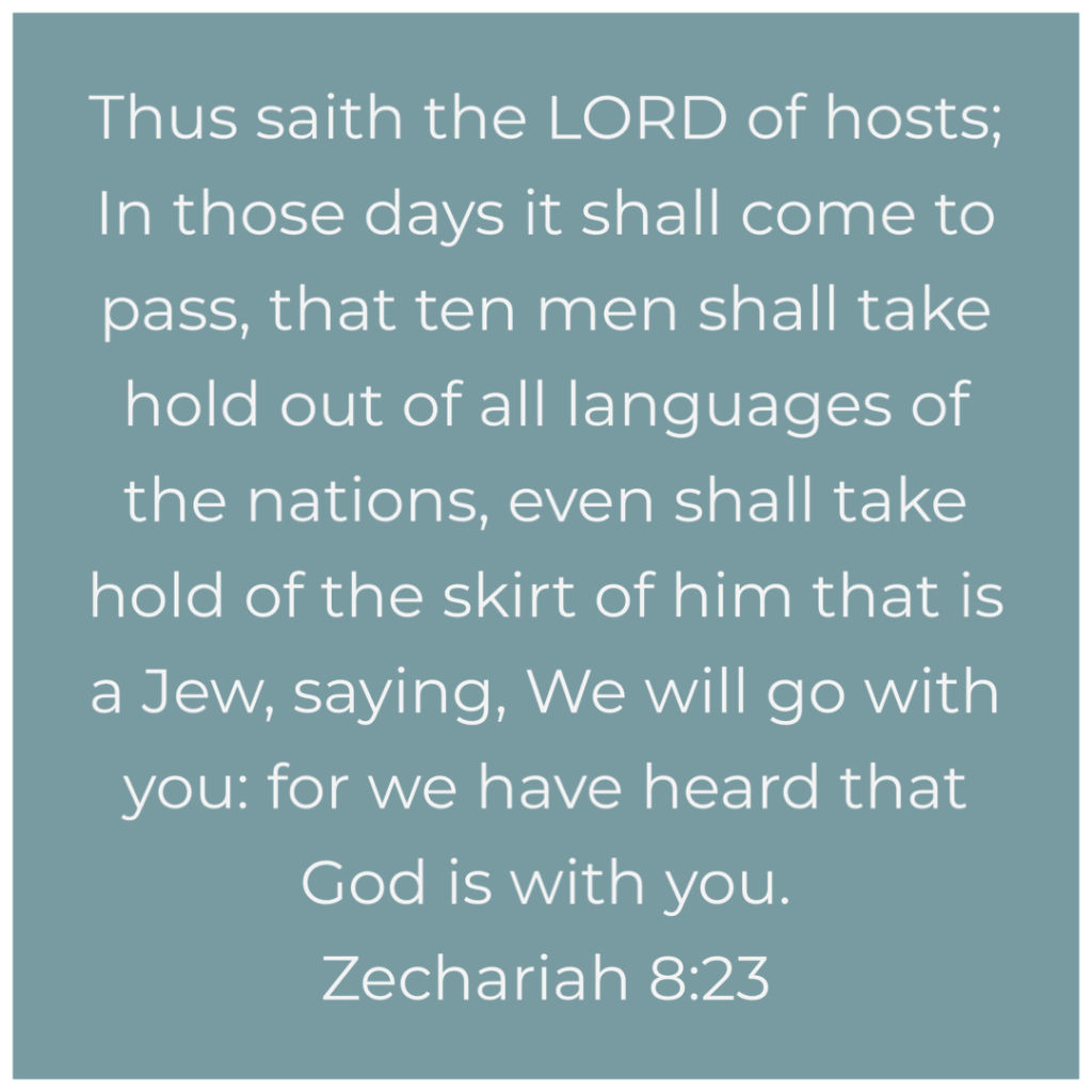 Thus saith the LORD of hosts; In those days it shall come to pass, that ten men shall take hold out of all languages of the nations, even shall take hold of the skirt of him that is a Jew, saying, We will go with you: for we have heard that God is with you.