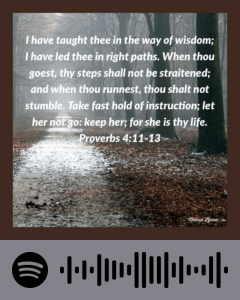 I have taught thee in the way of wisdom; I have led thee in right paths. When thou goest, thy steps shall not be straitened; and when thou runnest, thou shalt not stumble. Take fast hold of instruction; let her not go: keep her; for she is thy life. ~ Proverbs 4:11-13