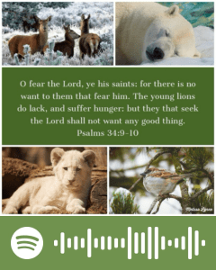 O fear the Lord, ye his saints: for there is no want to them that fear him. The young lions do lack, and suffer hunger: but they that seek the Lord shall not want any good thing.– Psalms 34:9-10