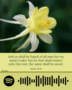 Now the brother shall betray the brother to death, and the father the son; and children shall rise up against their parents, and shall cause them to be put to death. And ye shall be hated of all men for my name’s sake: but he that shall endure unto the end, the same shall be saved. – Mark 13:12-13