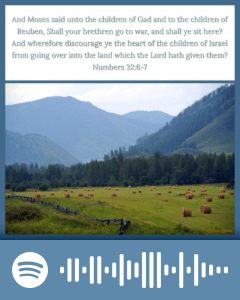 Now the children of Reuben and the children of Gad had a very great multitude of cattle: and when they saw the land of Jazer, and the land of Gilead, that, behold, the place was a place for cattle; the children of Gad and the children of Reuben came and spake unto Moses, and to Eleazar the priest, and unto the princes of the congregation, saying, Ataroth, and Dibon, and Jazer, and Nimrah, and Heshbon, and Elealeh, and Shebam, and Nebo, and Beon, even the country which the LORD smote before the congregation of Israel, is a land for cattle, and thy servants have cattle: wherefore, said they, if we have found grace in thy sight, let this land be given unto thy servants for a possession, and bring us not over Jordan. And Moses said unto the children of Gad and to the children of Reuben, Shall your brethren go to war, and shall ye sit here? And wherefore discourage ye the heart of the children of Israel from going over into the land which the LORD hath given them? – Numbers 32:1-7