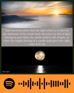 Take heed therefore that the light which is in thee be not darkness. If thy whole body therefore be full of light, having no part dark, the whole shall be full of light, as when the bright shining of a candle doth give thee light.– Luke 11:35-36