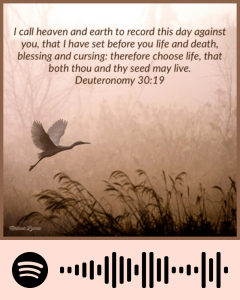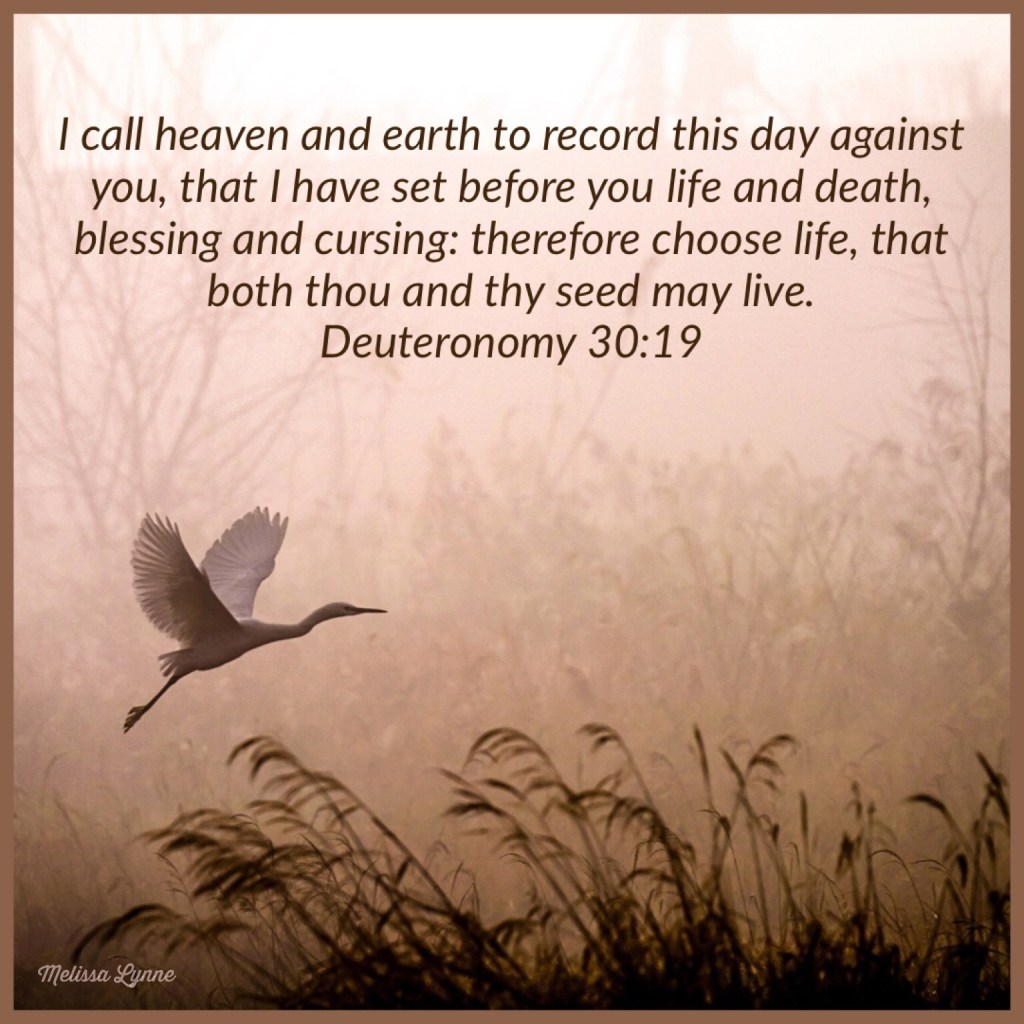 See, I have set before thee this day life and good, and death and evil; in that I command thee this day to love the LORD thy God, to walk in his ways, and to keep his commandments and his statutes and his judgments, that thou mayest live and multiply: and the LORD thy God shall bless thee in the land whither thou goest to possess it. But if thine heart turn away, so that thou wilt not hear, but shalt be drawn away, and worship other gods, and serve them; I denounce unto you this day, that ye shall surely perish, and that ye shall not prolong your days upon the land, whither thou passest over Jordan to go to possess it. I call heaven and earth to record this day against you, that I have set before you life and death, blessing and cursing: therefore choose life, that both thou and thy seed may live: that thou mayest love the LORD thy God, and that thou mayest obey his voice, and that thou mayest cleave unto him: for he is thy life, and the length of thy days: that thou mayest dwell in the land which the LORD sware unto thy fathers, to Abraham, to Isaac, and to Jacob, to give them. – Deuteronomy 30:15-20
