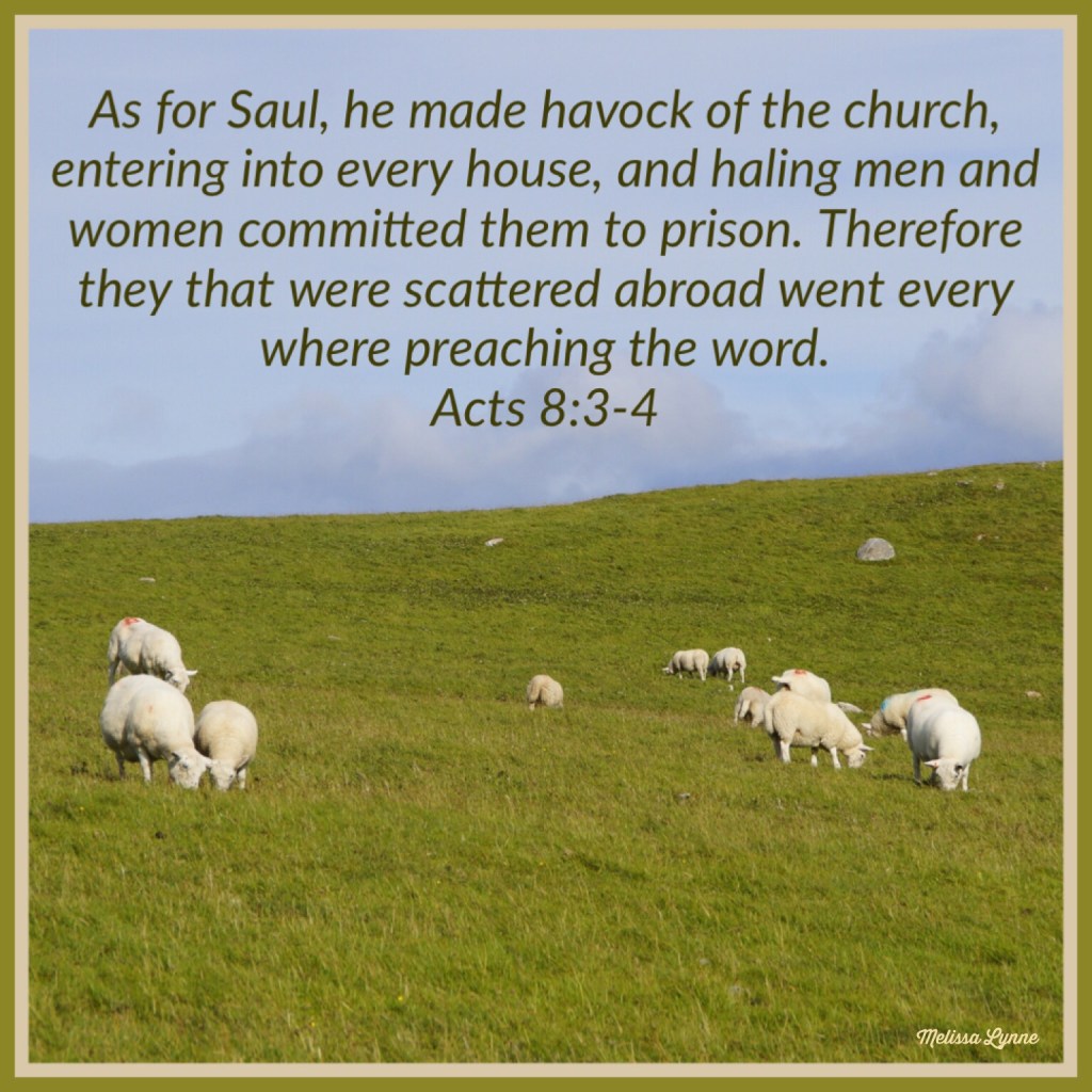 And at that time there was a great persecution against the church which was at Jerusalem; and they were all scattered abroad throughout the regions of Judaea and Samaria, except the apostles. And devout men carried Stephen to his burial, and made great lamentation over him. As for Saul, he made havock of the church, entering into every house, and haling men and women committed them to prison. Therefore they that were scattered abroad went every where preaching the word. – Acts 8:1b-4