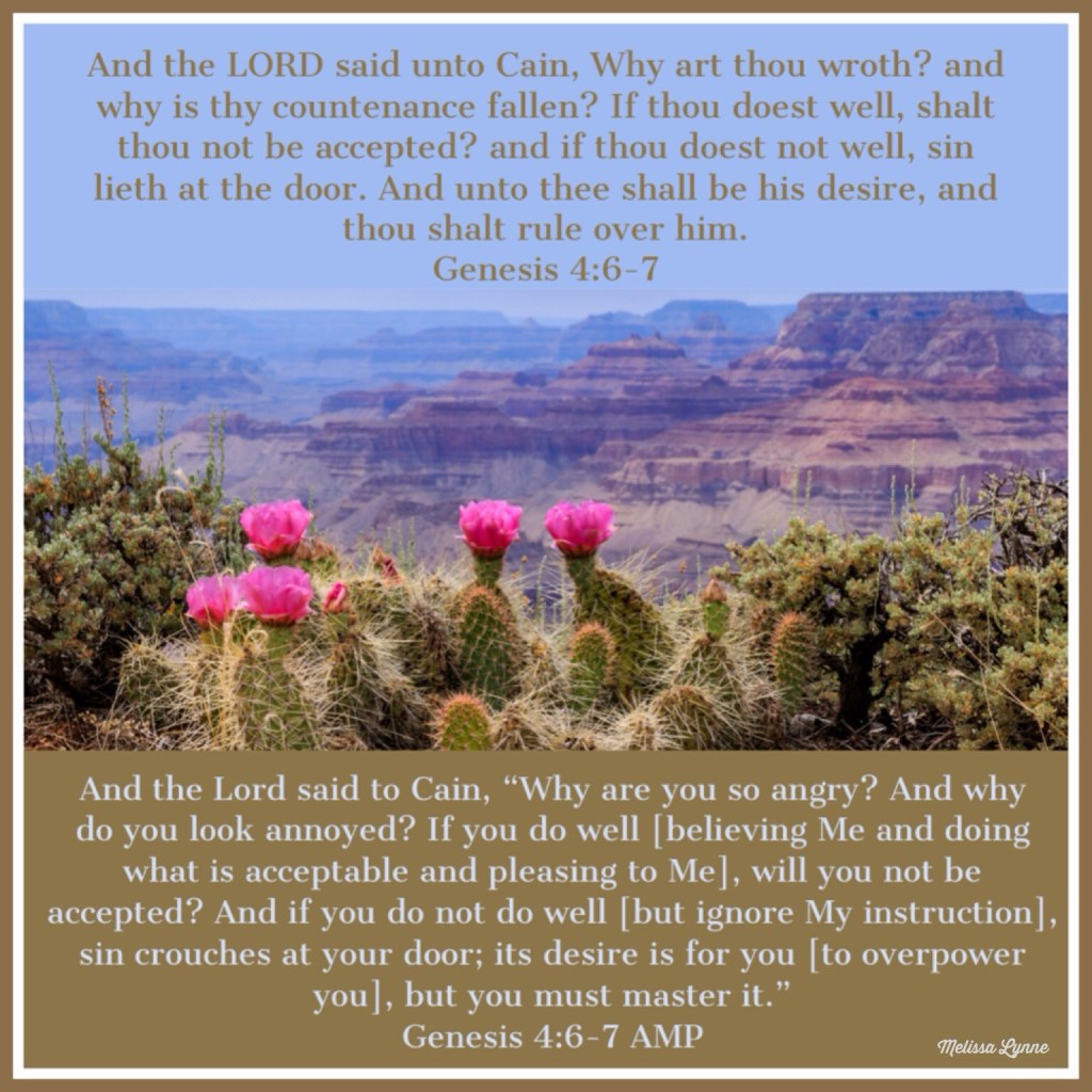 And the Lord said to Cain, “Why are you so angry? And why do you look annoyed? If you do well [believing Me and doing what is acceptable and pleasing to Me], will you not be accepted? And if you do not do well [but ignore My instruction], sin crouches at your door; its desire is for you [to overpower you], but you must master it.” – Genesis 4:6-7 AMP