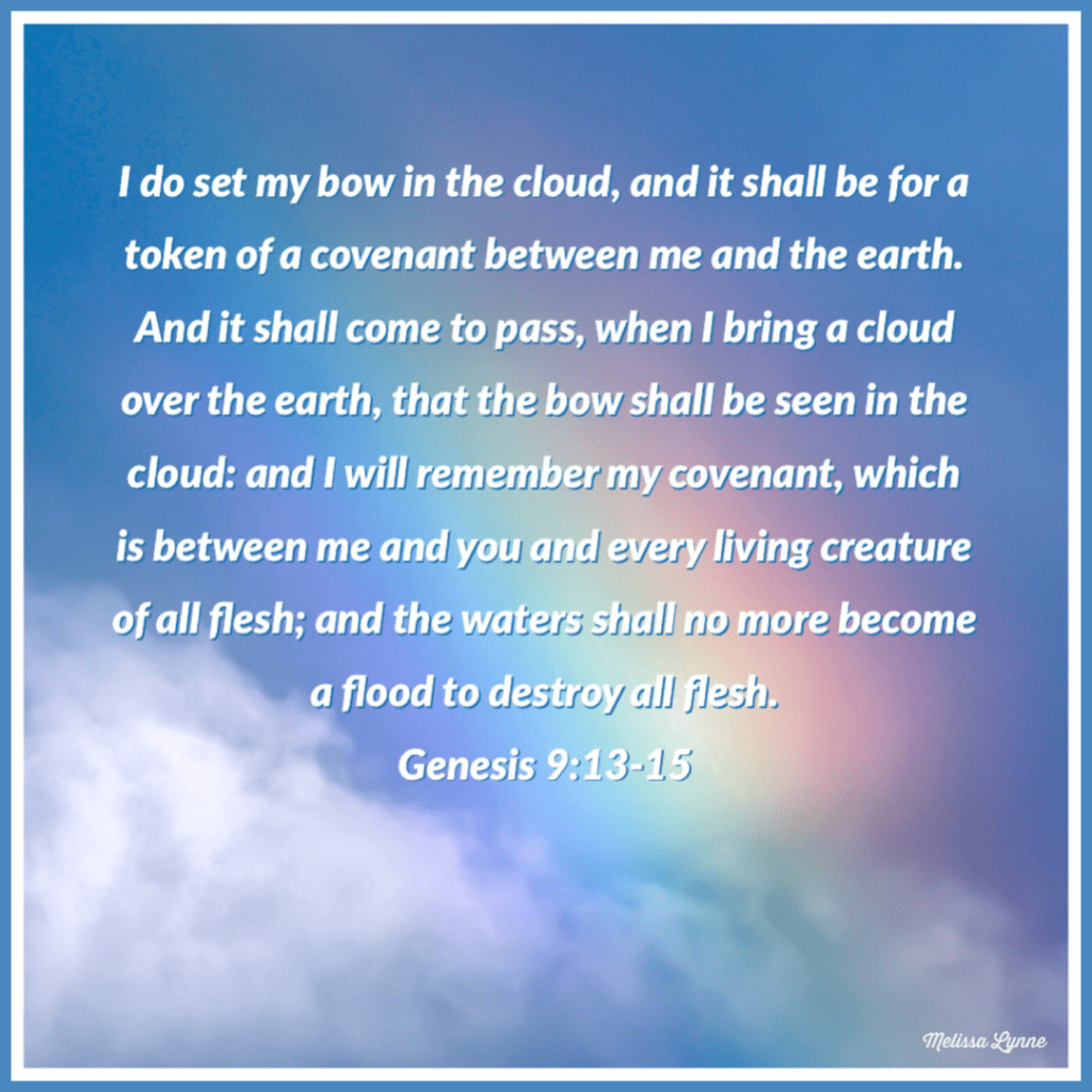 And God spake unto Noah, and to his sons with him, saying, And I, behold, I establish my covenant with you, and with your seed after you; and with every living creature that is with you, of the fowl, of the cattle, and of every beast of the earth with you; from all that go out of the ark, to every beast of the earth. And I will establish my covenant with you; neither shall all flesh be cut off any more by the waters of a flood; neither shall there any more be a flood to destroy the earth. And God said, This is the token of the covenant which I make between me and you and every living creature that is with you, for perpetual generations: I do set my bow in the cloud, and it shall be for a token of a covenant between me and the earth. And it shall come to pass, when I bring a cloud over the earth, that the bow shall be seen in the cloud: and I will remember my covenant, which is between me and you and every living creature of all flesh; and the waters shall no more become a flood to destroy all flesh. And the bow shall be in the cloud; and I will look upon it, that I may remember the everlasting covenant between God and every living creature of all flesh that is upon the earth. And God said unto Noah, This is the token of the covenant, which I have established between me and all flesh that is upon the earth. – Genesis 9:8-17