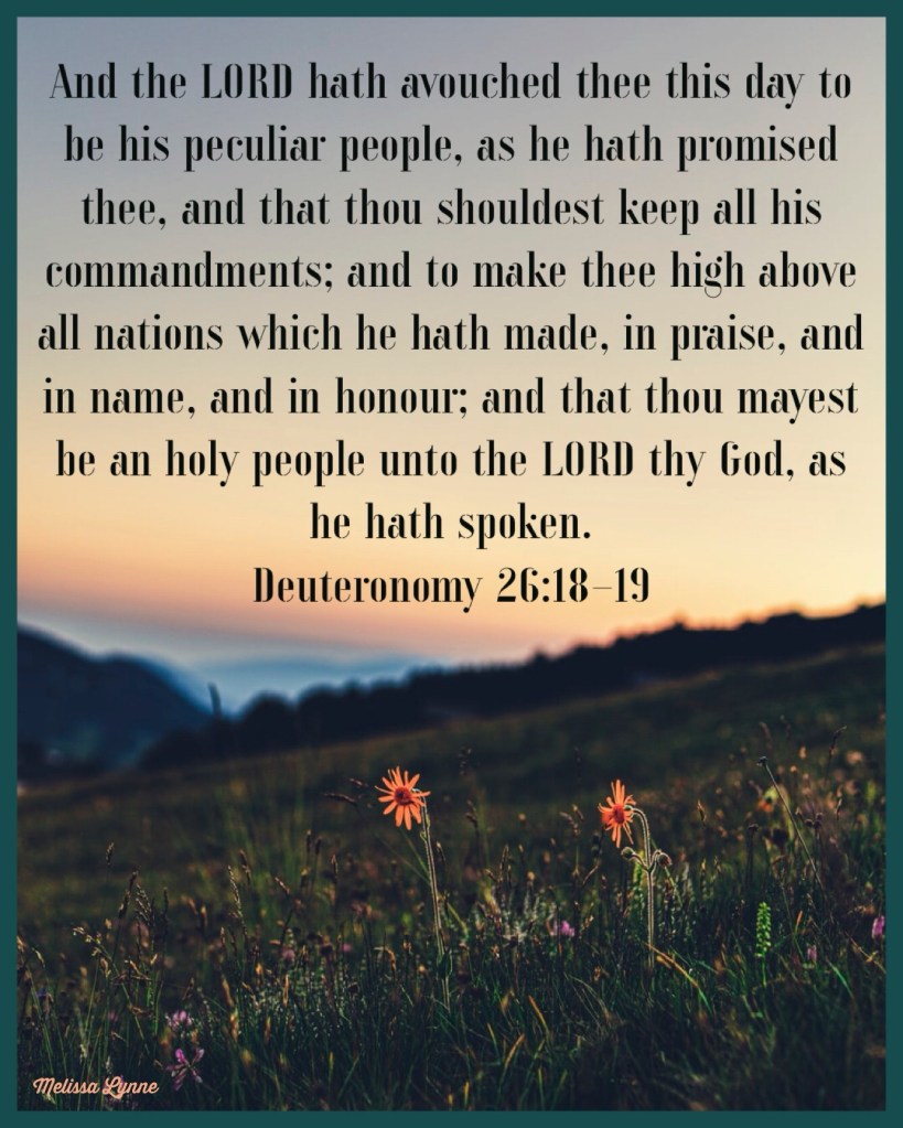 This day the LORD thy God hath commanded thee to do these statutes and judgments: thou shalt therefore keep and do them with all thine heart, and with all thy soul. Thou hast avouched the LORD this day to be thy God, and to walk in his ways, and to keep his statutes, and his commandments, and his judgments, and to hearken unto his voice: and the LORD hath avouched thee this day to be his peculiar people, as he hath promised thee, and that thou shouldest keep all his commandments; and to make thee high above all nations which he hath made, in praise, and in name, and in honour; and that thou mayest be an holy people unto the LORD thy God, as he hath spoken. – Deuteronomy 26:16-19