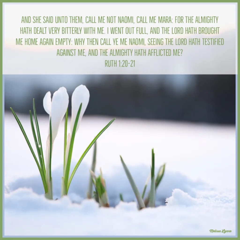 So they two went until they came to Beth-lehem. And it came to pass, when they were come to Beth-lehem, that all the city was moved about them, and they said, Is this Naomi? And she said unto them, Call me not Naomi, call me Mara: for the Almighty hath dealt very bitterly with me. I went out full, and the LORD hath brought me home again empty: why then call ye me Naomi, seeing the LORD hath testified against me, and the Almighty hath afflicted me? – Ruth 1:19-21