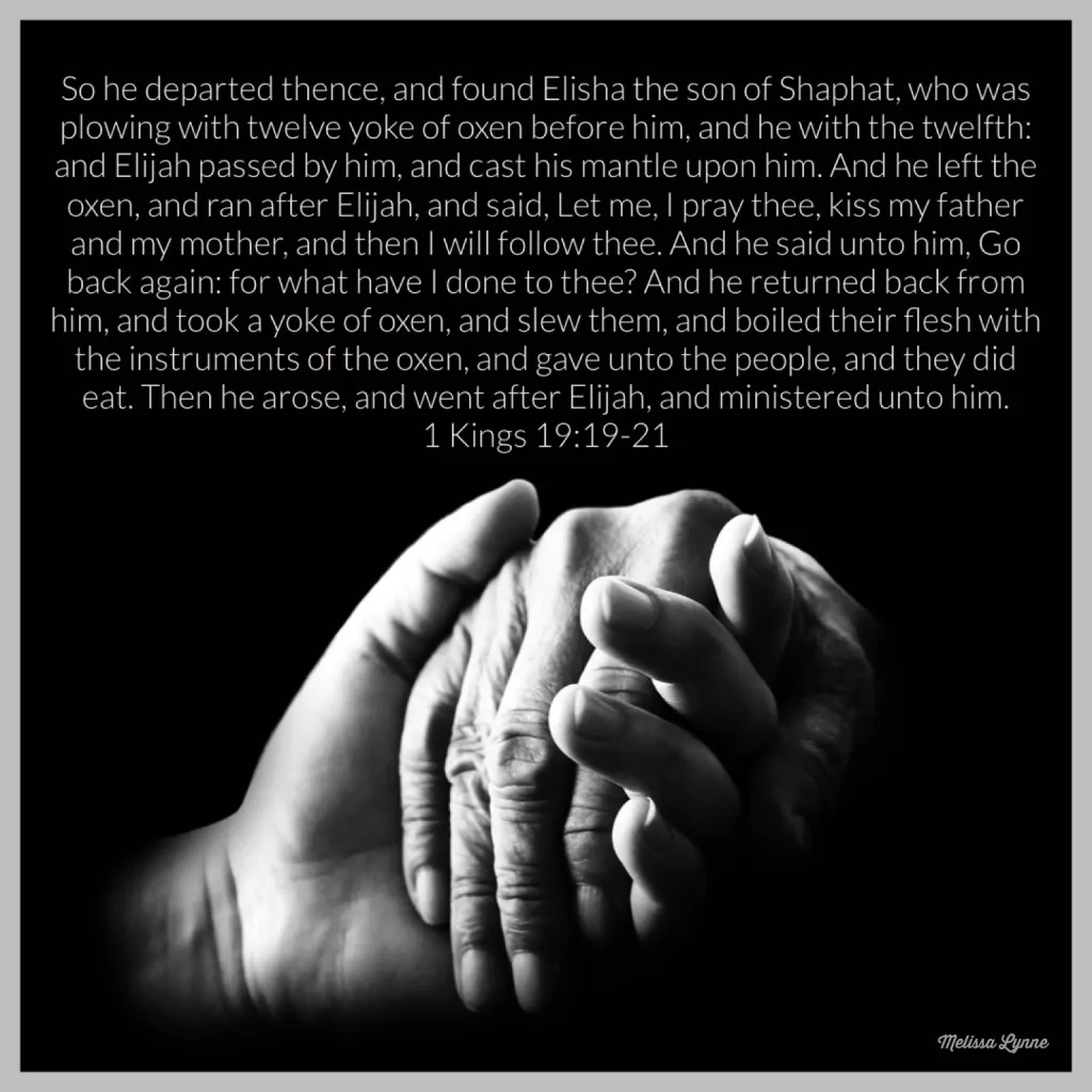 Elisha asks first to say goodbye to his parents. He is given permission. He goes home, kills his flock and cooks it all, and feeds the people. Then Elisha arose, followed Elijah, and ministered to him (and God).