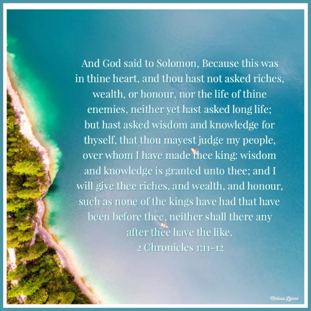 And God said to Solomon, Because this was in thine heart, and thou hast not asked riches, wealth, or honour, nor the life of thine enemies, neither yet hast asked long life; but hast asked wisdom and knowledge for thyself, that thou mayest judge my people, over whom I have made thee king: wisdom and knowledge is granted unto thee; and I will give thee riches, and wealth, and honour, such as none of the kings have had that have been before thee, neither shall there any after thee have the like. – 2 Chronicles 1:11-12